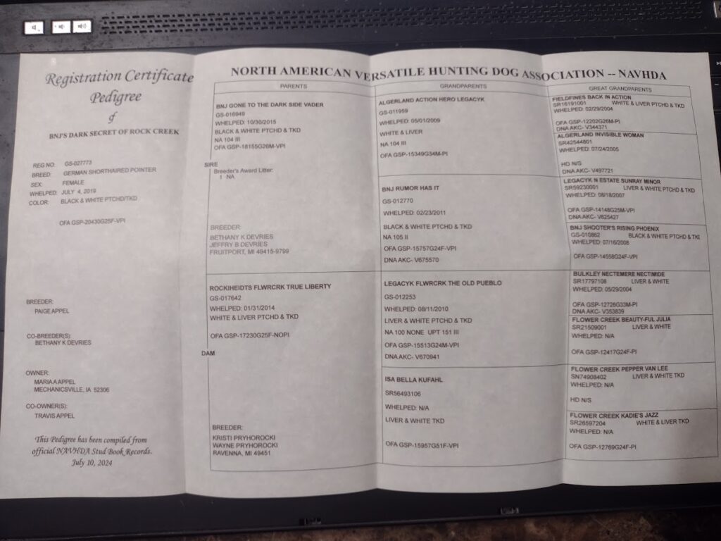 Alli completed her health testing, earned three Best of Breeds at a UKC show in Grinnel and a Gun Dog Group 4. She welcomed her first litter with Bruno “B” Litter. Check out Binx from that litter.
