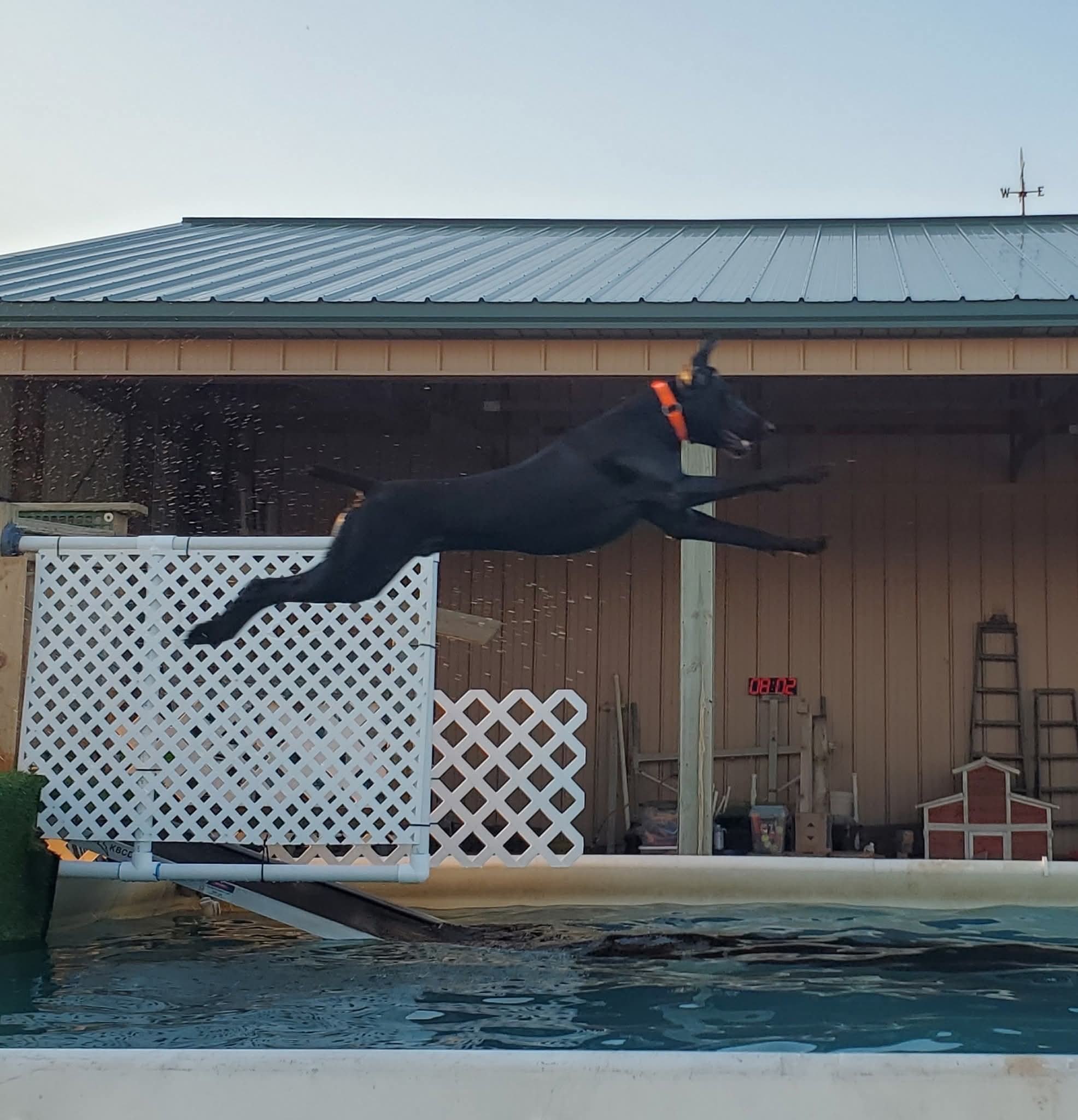 Binx has stood out to me from the time he started scaling the puppy pen at 5 weeks old. He never ceases to amaze me doing anything I ask of him. He was born 9/24/22 and is from our B Litter (Bruno x Alli). Binx earned a North American Versatile Hunting Dog Association Natural Ability Prize II (103) at 11 months old with minimal training. He is pointed in UKC conformation. He has earned his virtual scenwork beginner title. He also runs in AKC coursing ability tests earning both his CA and CAA, but where he really shines is on the dock. From becoming my first dog to earn a competition jump to taking me to my first NADD Nationals Binx is also training to become my first professional working dog in narcotics detection. It has been a learning process for us both, but his love for toys and pleasing me has us working towards our certification. He is taking me on a journey we won’t forget.