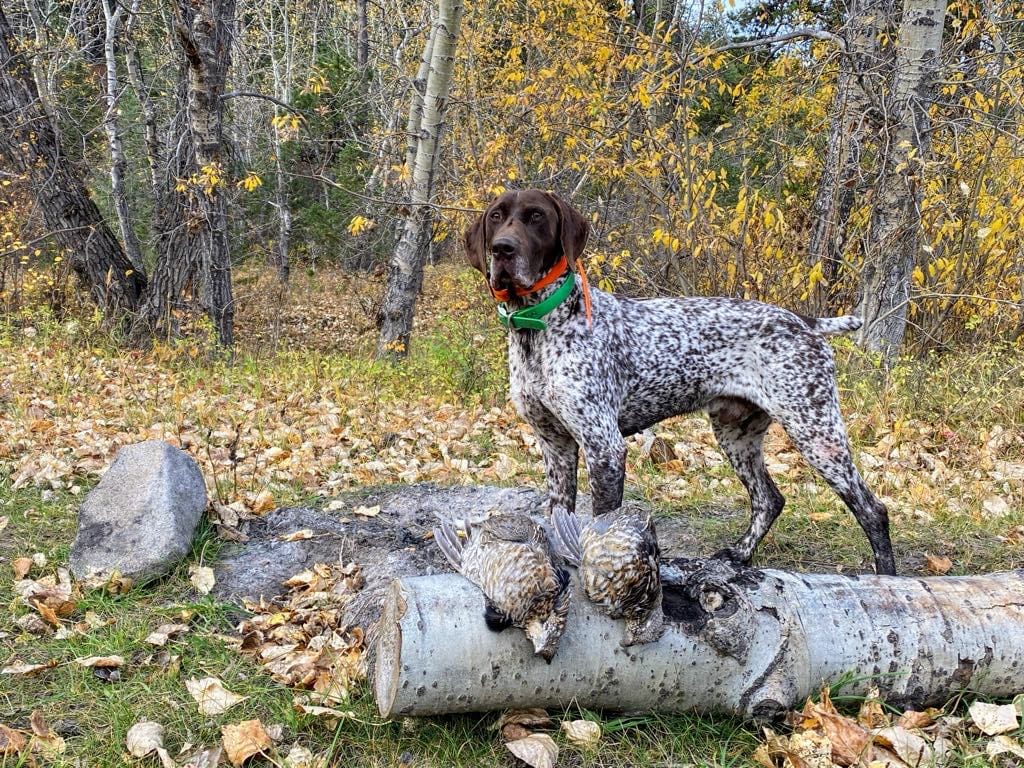 Colt is described as ‘the best wild bird dog I’ve ever owned’. He can range up to 300 yards on open prairies but ranges in close for pheasant. He has a natural retrieve and back. His pedigree has many NAVHDA VC in it. His AKC championship was finished by our own Paige in 2018. CHIC 155405 (all passing results)